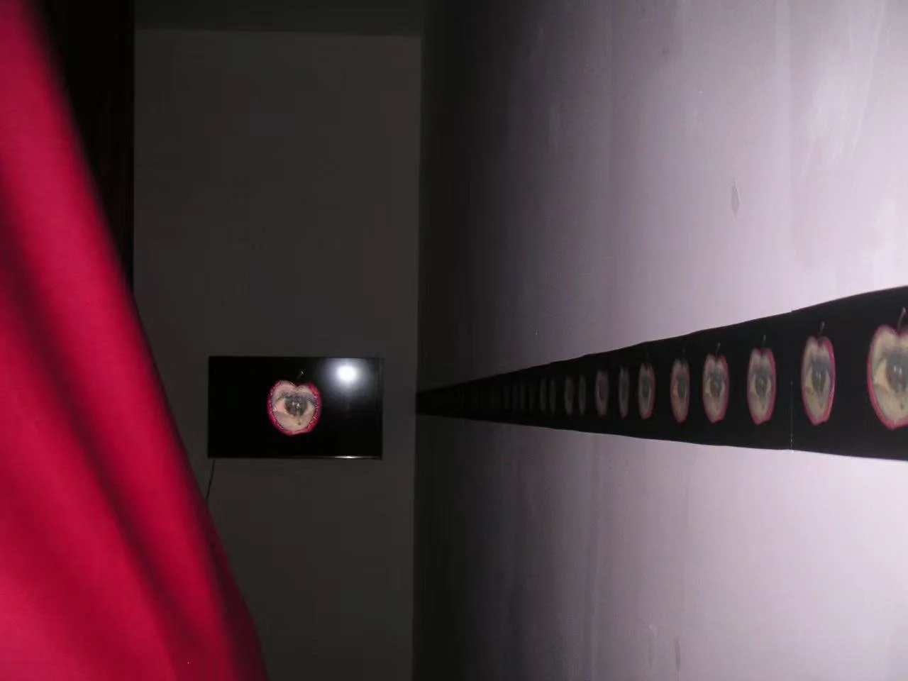 《苹果》是现实世界中关于衰老与流逝的一个隐喻。家人重病让凯来直观地看到了一个生命衰老、萎缩最后消逝的过程,促使她切身地思考时间和生命,并将这个过程转译在她的创作中。她用宝丽来拍摄了自己的眼睛,将它移膜到苹果上。苹果每天都失去一点水分,不断氧化,目光也随之萎缩,失去光泽,凯来每天扫描一次这个组合而成的生命体,记录它的变化,除了中间空白的几天。当时她从英国回到国内,参加了家人的葬礼。她把这一段停顿也保留了下来,真实的死亡就这样混合进摄影中,隐喻与现实在《苹果》这件作品中合二为一。