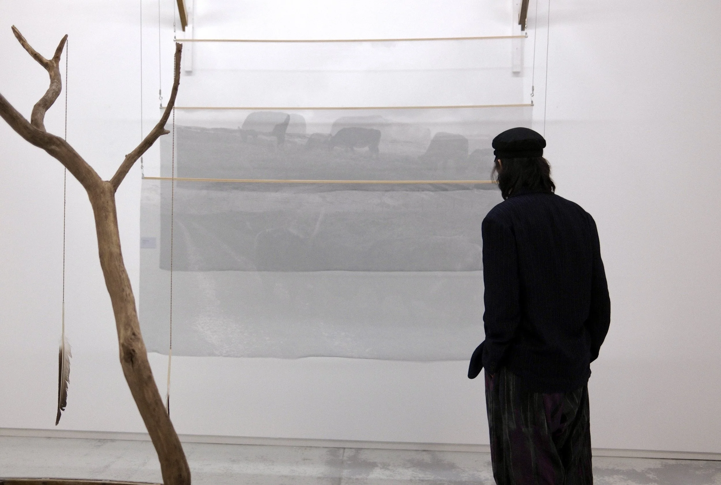 Q5: The first time I saw this piece fluttering beneath the bridge, I could sense its remarkable precision. You resemble someone at dusk using a twig to lift a spider's web and capture a dragonfly. Your imagery embraces the wind, ensnaring it within this fabric alongside your emotions. The crow that casts its shadow upon the cloth takes flight once more in the breeze. In your current exhibition piece, 'Come by the Wind — Across', the image of a walking figure is reproduced on organza. Viewers pass through life-sized portraits, moving through a crowd as if they are real and becoming part of the work itself. Could you tell us about this series?