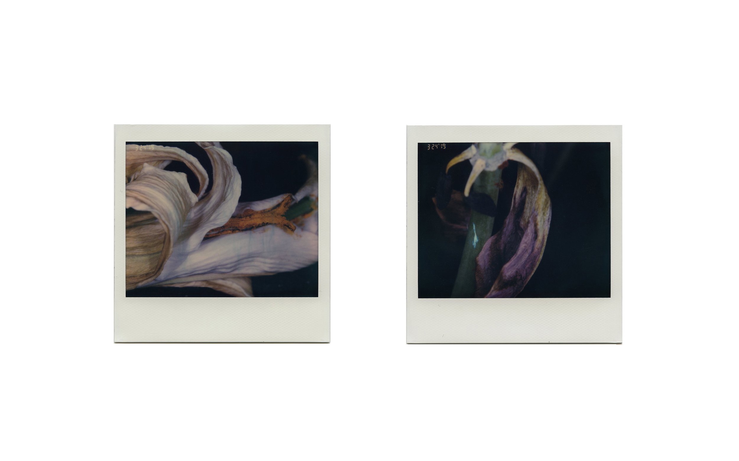《苹果》是我用Polaroid Macro相机创作的系列作品中的一组。2019年宝丽来公司在社交媒体上宣布停止生产适配这款相机的宽幅相纸;2020年1月1日,我发现这台相机并没有和我们一起跨进下一个十年,相机后背的时间自动退回1994,它出生的那年,这意味着设计者并没有期待它活到这个时代。尽管我储存了很多相纸试图延长其使用寿命,但它似乎注定要离开我们:那些相纸在过期多年后开始无法显示完整的画面和正确的颜色,成像变得越来越模糊——我随即开始用它们去捕捉一些生命的瞬间。这个系列里除了苹果,我还拍摄了很多其他植物,记录了包括它们枯萎、腐烂在内的生命全过程。由于宝丽来材料的特殊性,可以通过移膜使图像与实物紧密结合,静止的图像便得以像皮肤一样附着在生物上。在《苹果》这组创作中,我每天记录下这个组合生命体变化的过程,这些被定格的生命瞬间本身也是一种时间切片。电影中通常使用定格让观众可以集中凝视画面中的细节,我试图用短暂的停滞让观众可以在原本流动的时间里感受到瞬间。