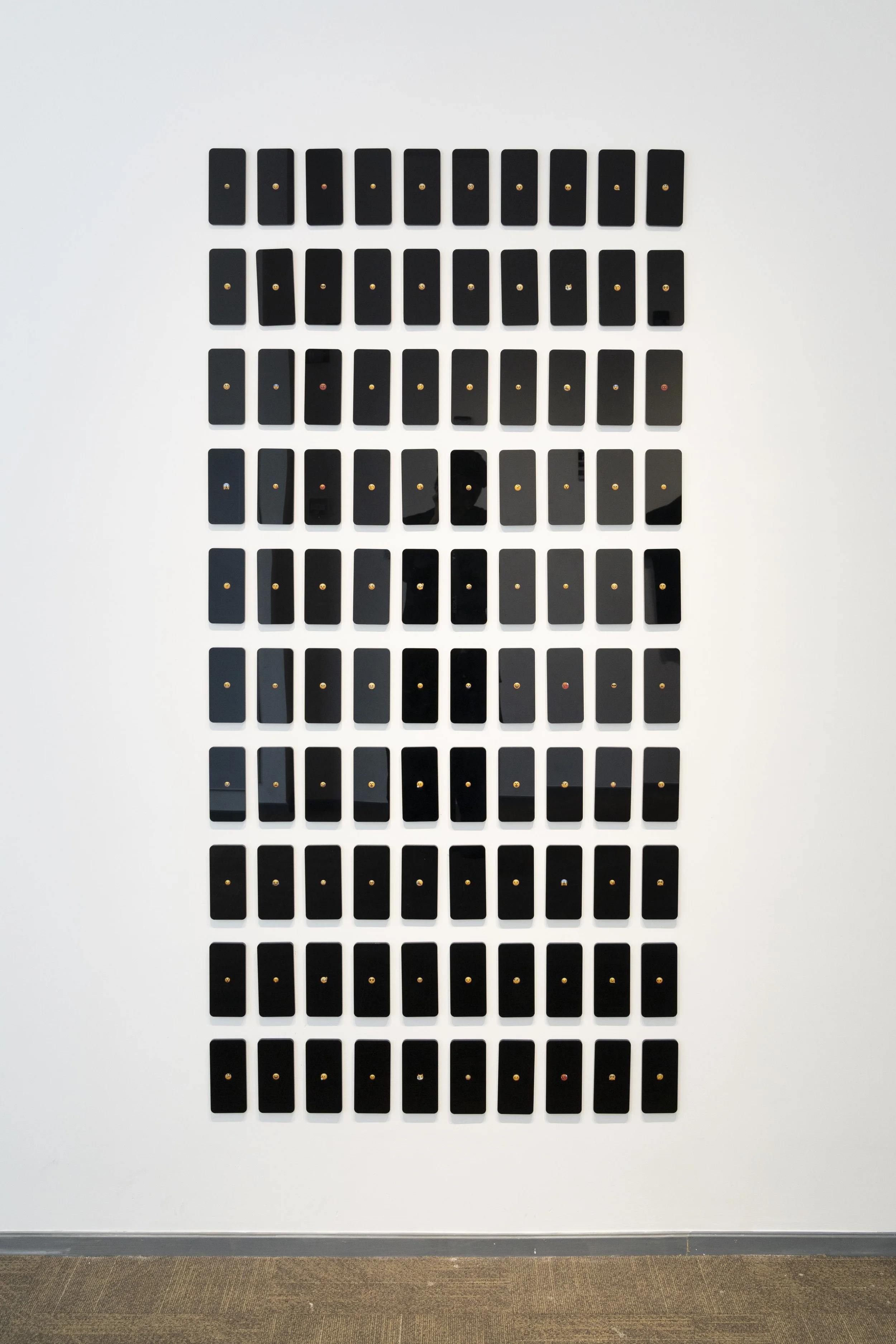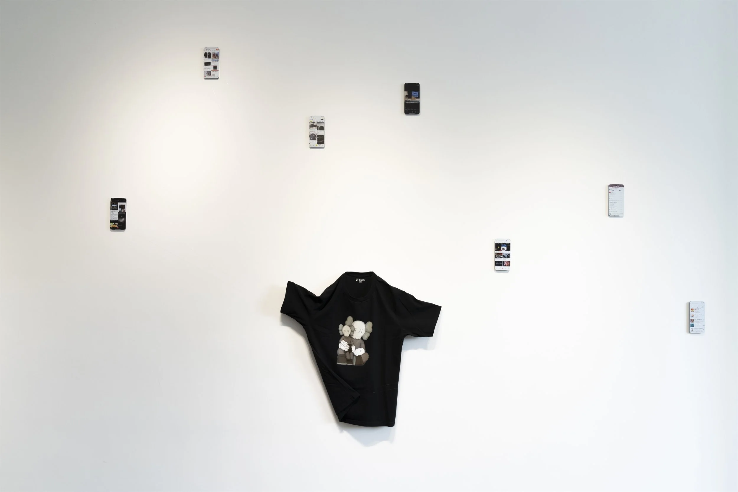 魏文涛:我最近的几个作品也都围绕人和现代技术之间的关系这条脉络展开的,比如去年在苏州驻地时新创作的两件装置,《黑盒傀儡》和《黑镜子》——前者以七块形似手机的黑色亚克力呈现我平时常用的几个app(小红书、bilibili、QQ音乐、美团外卖、淘宝、闲鱼)界面的截图,上面呈现了大数据算法下的我的个人喜好,连同悬挂展陈的我驻留第一天穿过的衣服,把我本人近乎透明地展示给观众,也包含了对信息茧房与算法监控的隐喻;后者则使用了100个黑色亚克力“手机”展现100个emoji,指向数字时代人们更容易迷失在以“我”为尺度建立起的世界中,自恋甚至自闭倾向愈发导致了对他者的忽视,每个当代人的孤独感都在加深。未来我仍然希望用艺术的方式去呈现人和科学技术的碰撞,可能不再局限于摄影或平面作品,会有更多具有空间感的装置作品。